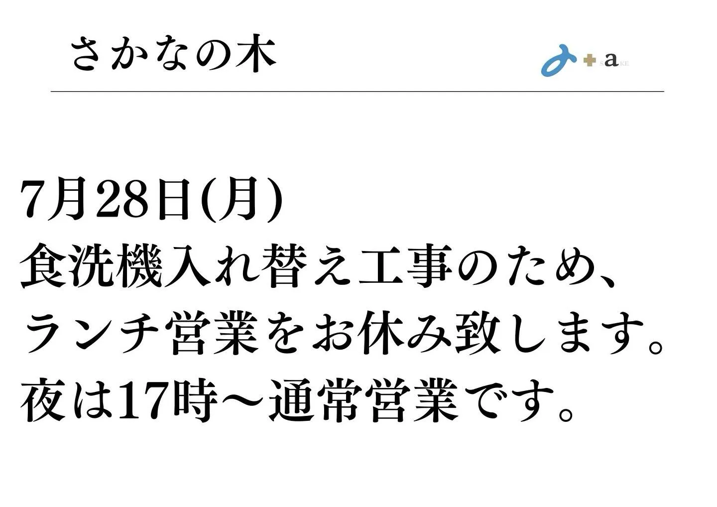 さかなの木 【お知らせ】 来週28日(月)ですが、食洗機の入れ替え工事のため、ランチ営業をお休み致します。 夜は17時より通常営業です。