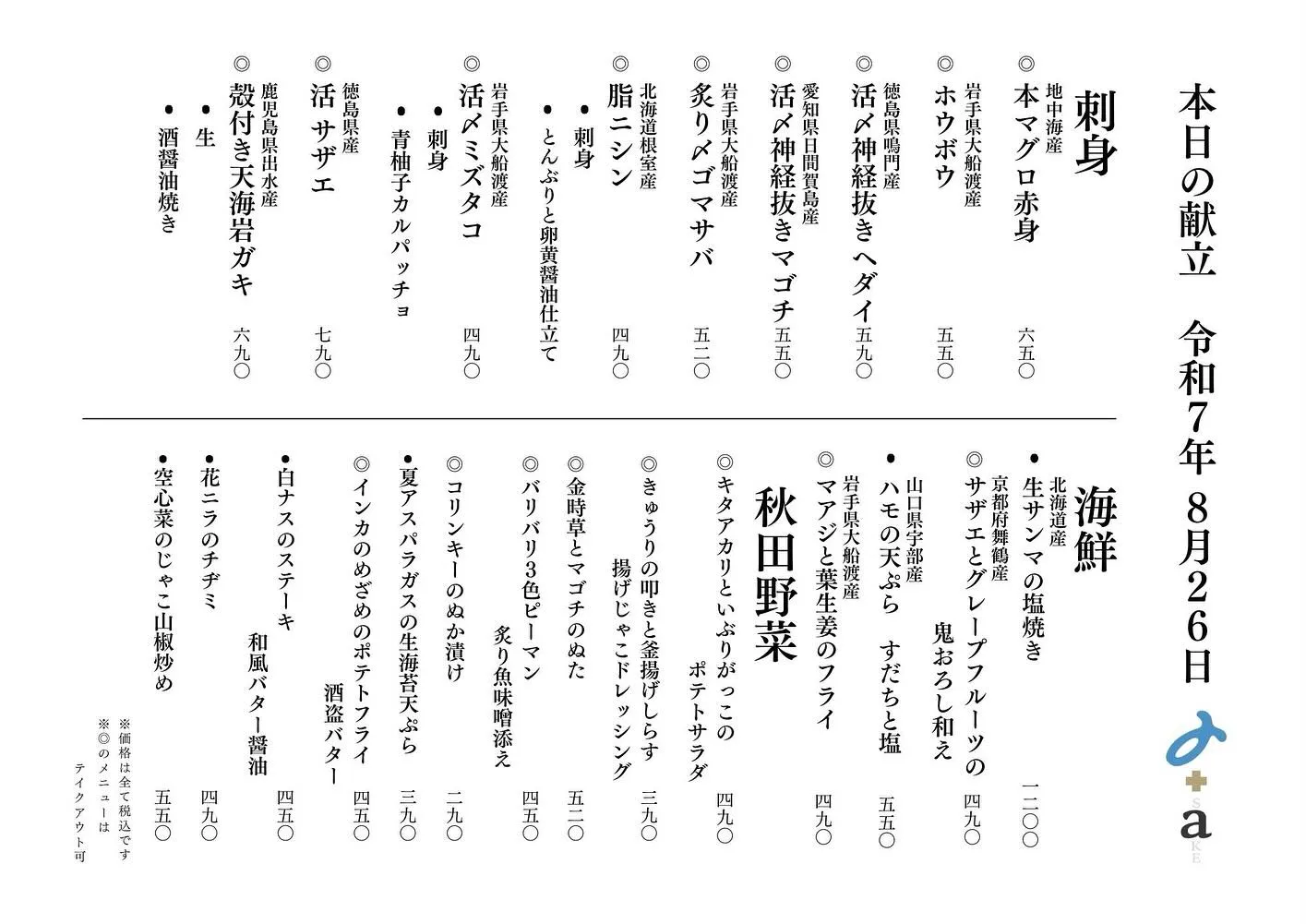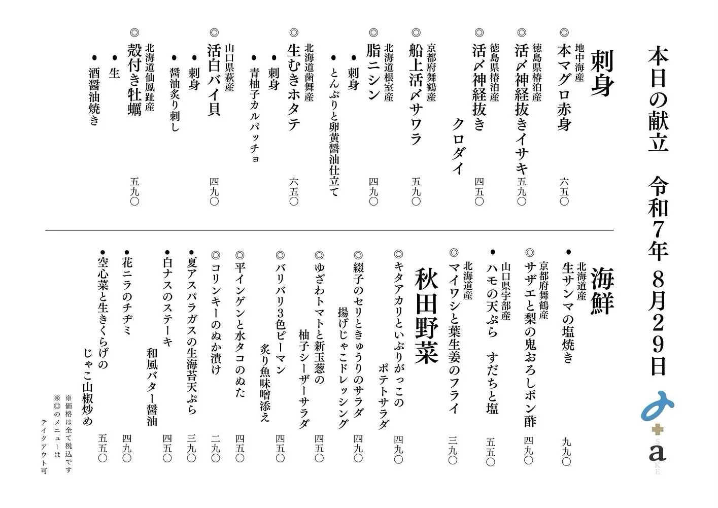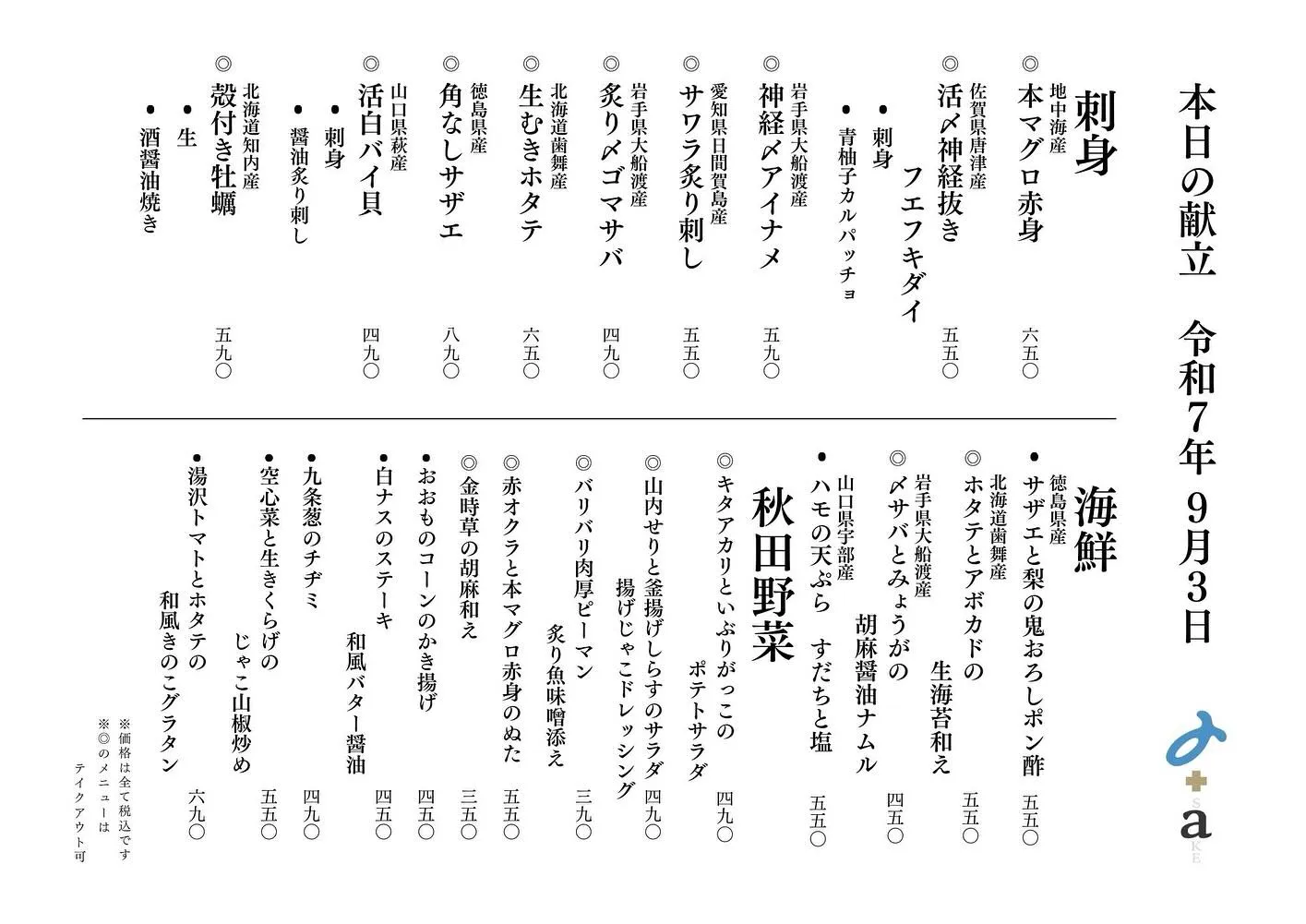 さかなの木9月3日のメニューです。今週は秋田野菜メニューが、少しずつ秋色に変わっていく予定です。日本酒もひやおろしがたくさん入荷したので、秋酒に入れ替えします。随時更新するのでお楽しみに。本…