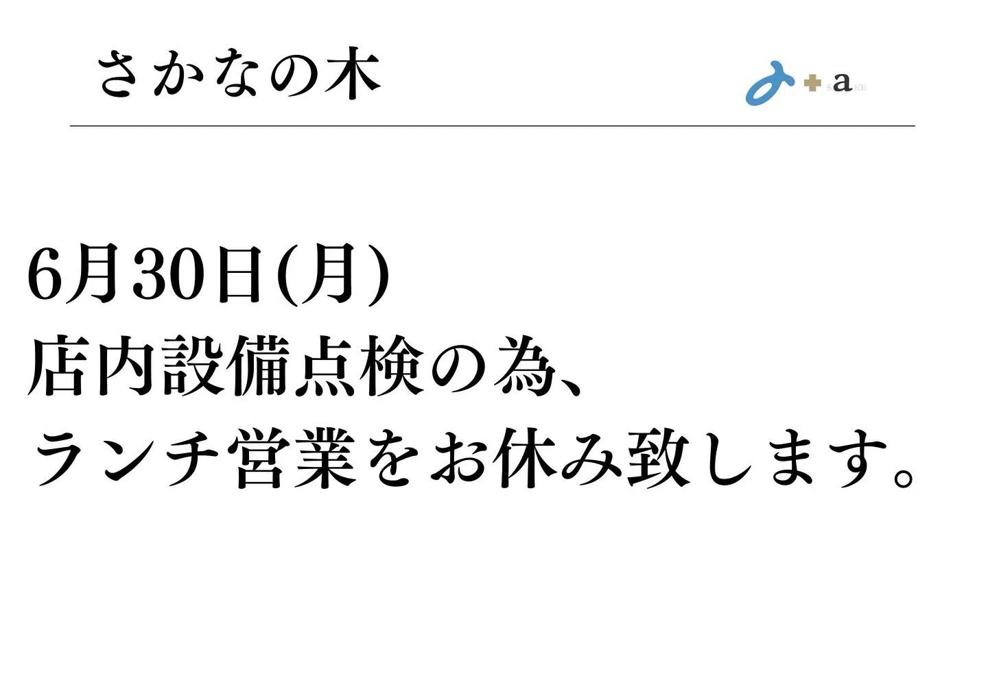 【臨時休業のお知らせ】 【臨時休業のお知らせ】本日6月30日のランチ営業は、店内設備点検の為お休み致します。夜は17:00〜通常営業致します。急でご迷惑をおかけしますが、ご理解の程宜しくお願い致します。#鵜の木#ランチ#さか…