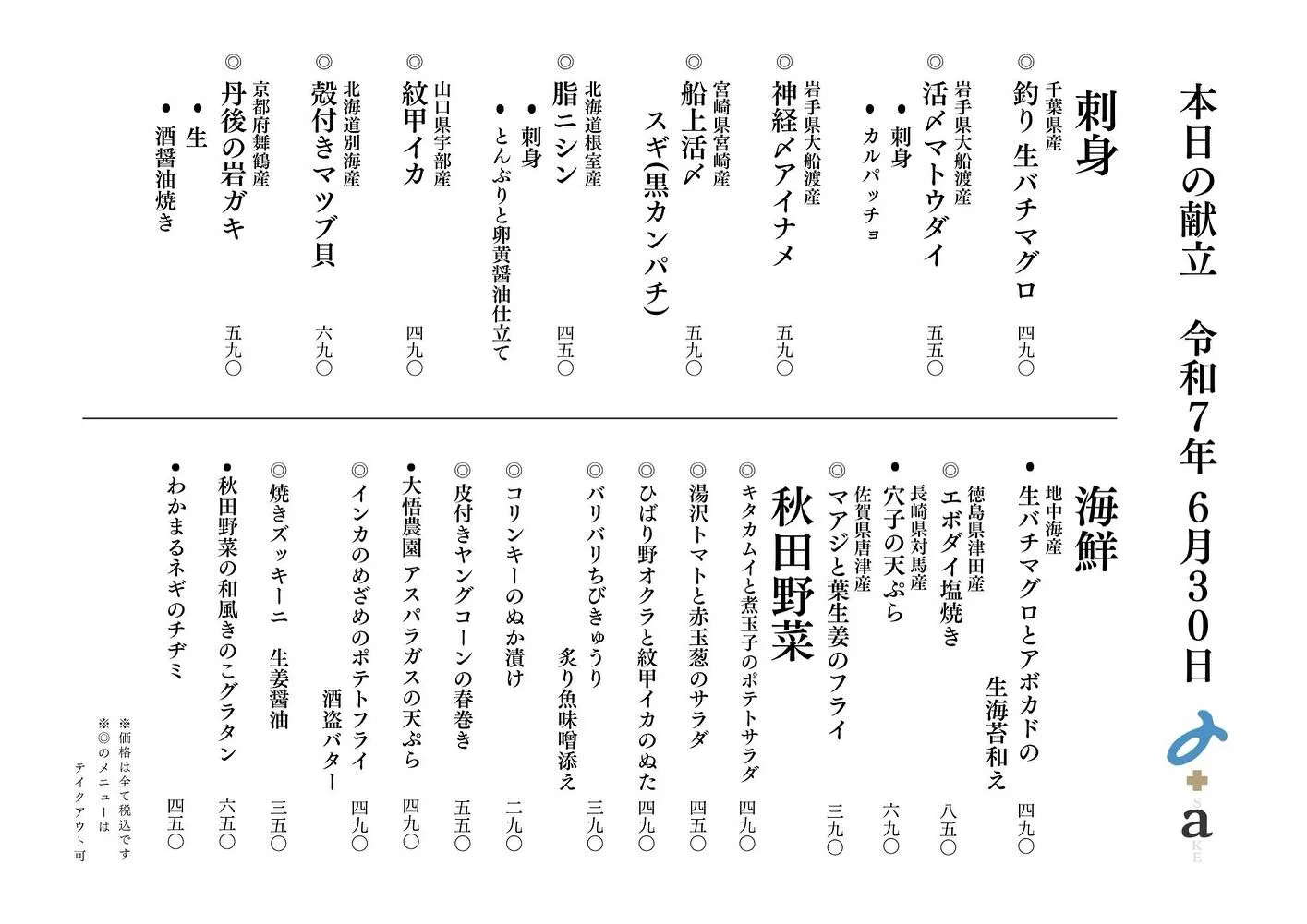 さかなの木7月8日のメニューです。 さかなの木7月8日のメニューです。本日のおすすめは田酒純米吟醸赤い彗星!100ml/杯/1,000円(税込み)です。メニューに載せていないので、インスタ見たとお声がけ下さい。また、新政も取り揃えております…