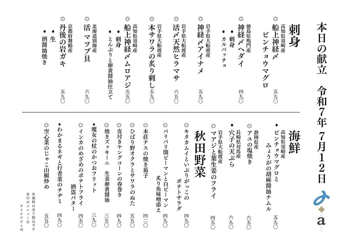 さかなの木7月12日のメニューです。 さかなの木7月12日のメニューです。お刺身はムロアジ、アイナメが特におすすめです。日本酒はくどき上手、七田が口開けです。また、メニューに載って無いプレミア日本酒もあります。本日22:00ラストオー…
