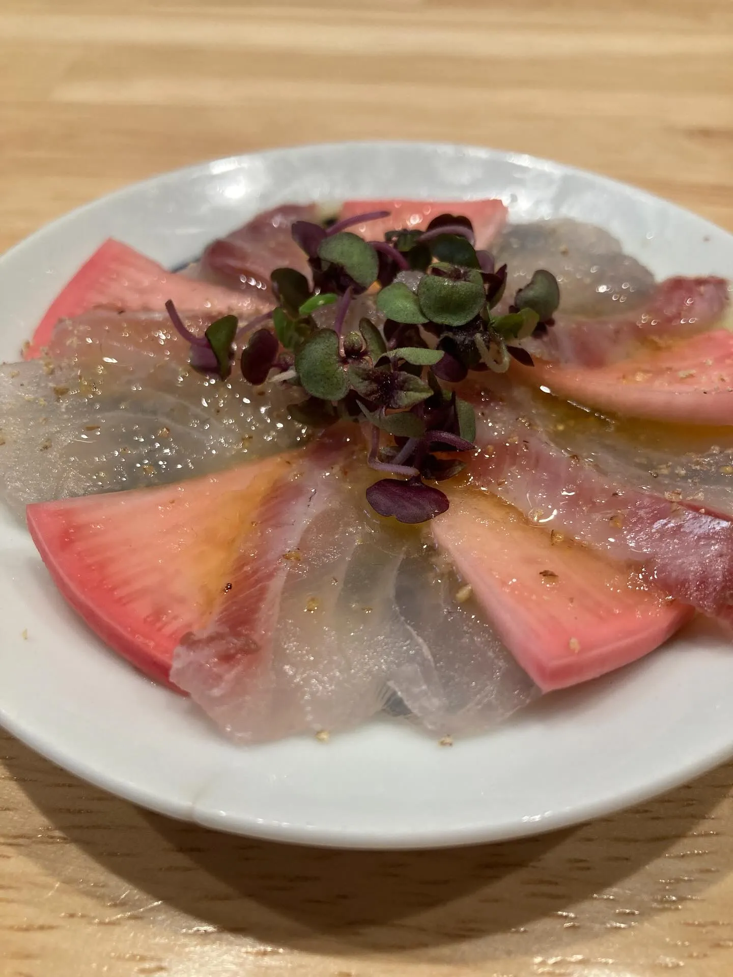 さかなの木11月13日のメニューです。秋田県産赤かぶを甘酢に漬けて、白身魚とカルパッチョに仕立てました。本日の白身はヒレの綺麗なホウボウです。ホウボウの旨味、赤かぶの甘味と酸味をオリーブオイル…