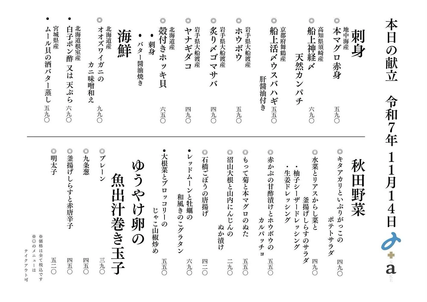 さかなの木11月3日のメニューです。本日は新酒3種類が口開けです!【彩來風初めしぼりたて無濃過生原酒】今年の新酒は、米の風味が粒立つように一層鮮やかに感じられ、日本酒らしい奥深さが際立ちます。…