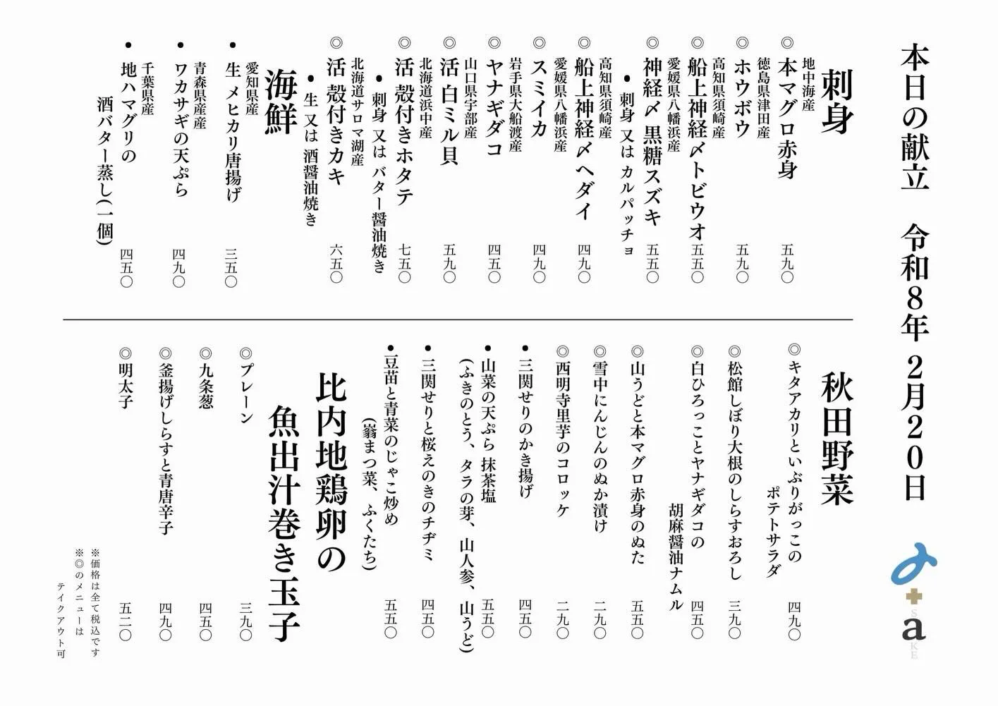 さかなの木2月20日のメニューです。 さかなの木2月20日のメニューです。本日のおすすめは生のメヒカリ唐揚げ!生だから美味しい身のフワフワ感を是非ご賞味下さい!3月の営業日は変わらず月〜土、祝日も営業致します。本日22:00ラストオーダ…