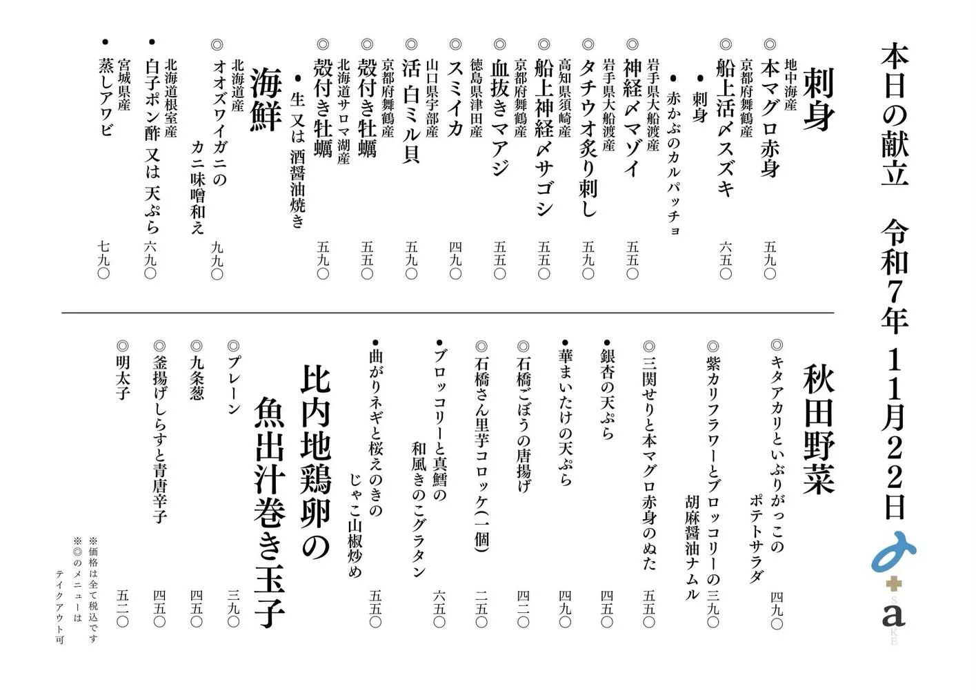 さかなの木11月26日のメニューです。 さかなの木11月26日のメニューです。写真は秋田の九条葱とミル貝のぬたです。隠し酒もあります!本日21:00ラストオーダー、22:00閉店です。#鵜の木#ランチ#さかなの木#気になる木#小料理屋#鮮魚#日本各地…