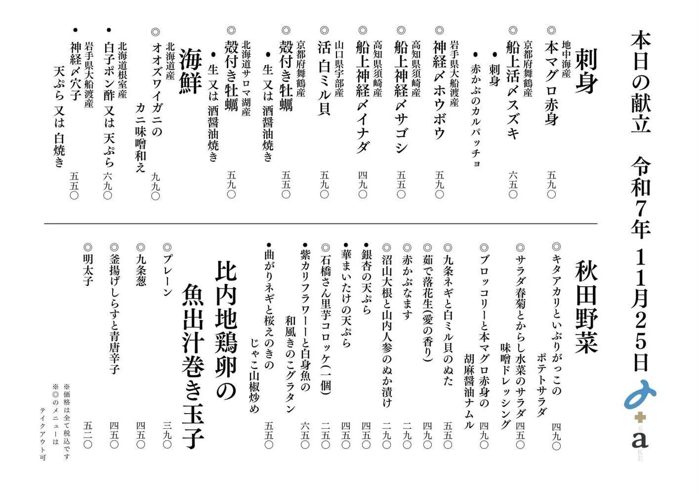 さかなの木12月10日のメニューです。 さかなの木12月10日のメニューです。本日のおすすめ日本酒はこちら!【山川光男2025ふゆ】今回は、男山酒造さんが担当する10周年を飾る記念の冬酒!山形県産の酒米「出羽燦々」を贅沢に精米歩合50%まで磨…